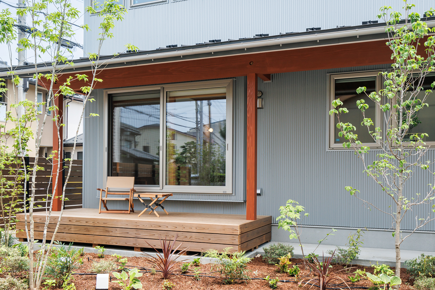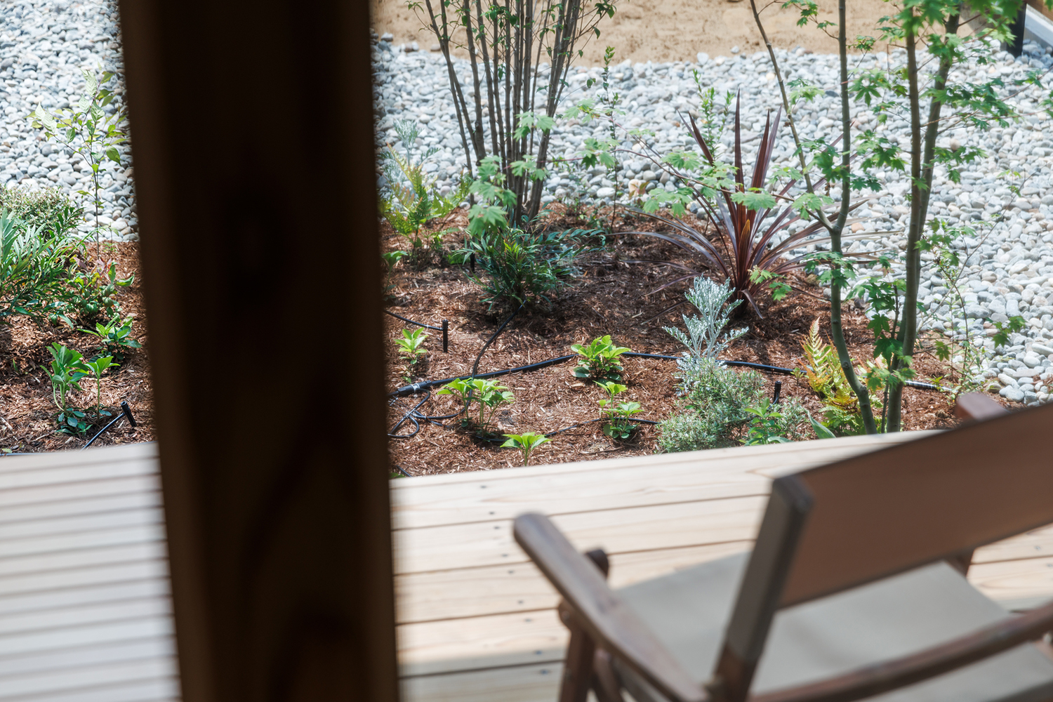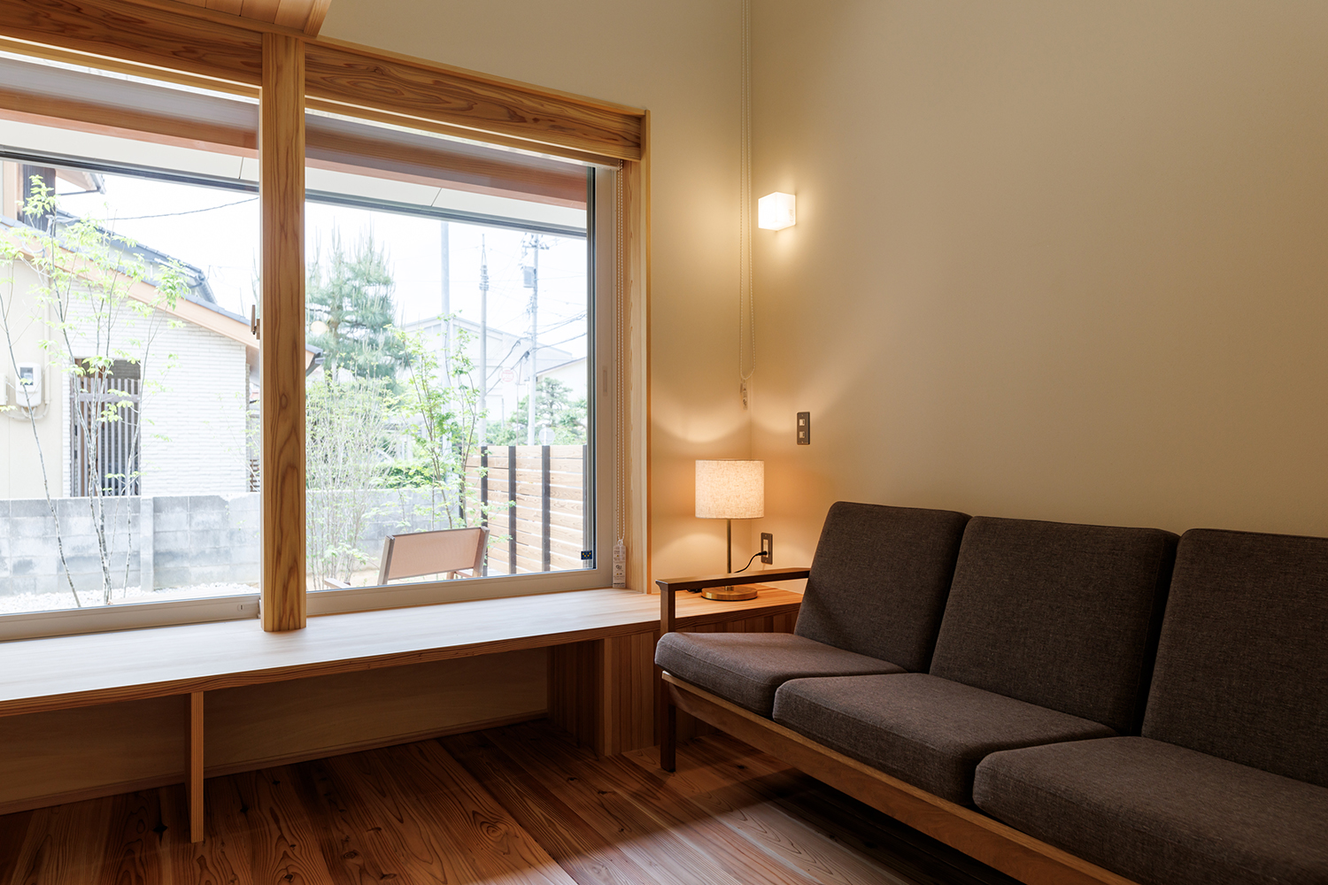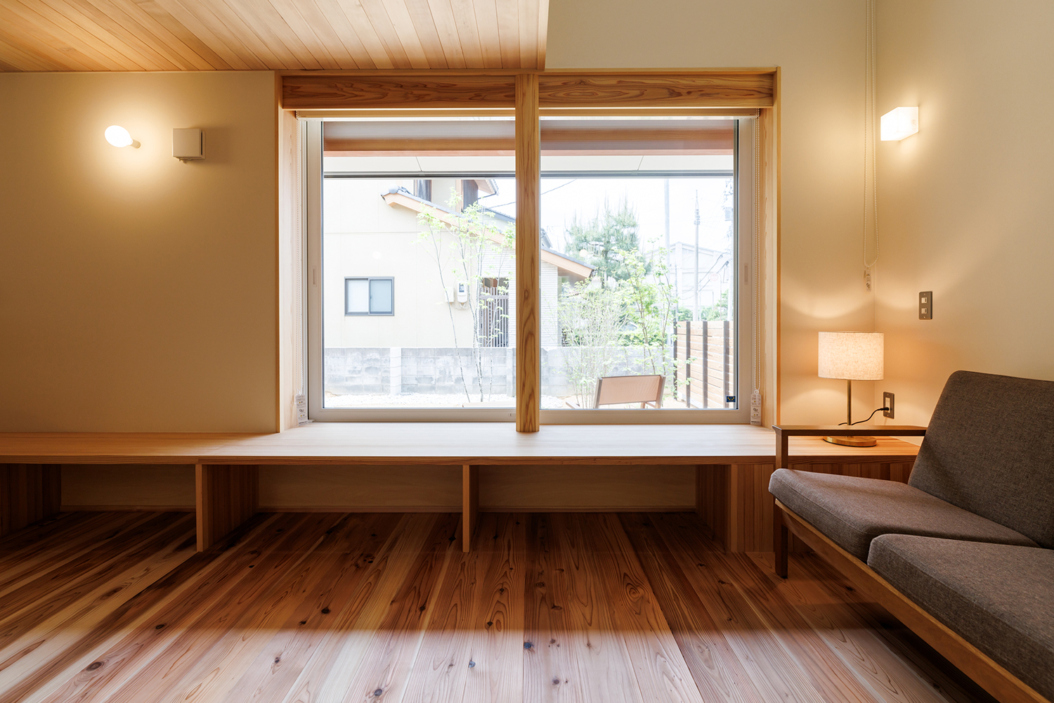 窓際ベンチからウッドデッキへと視線が抜け、自然との一体感を生み出します。