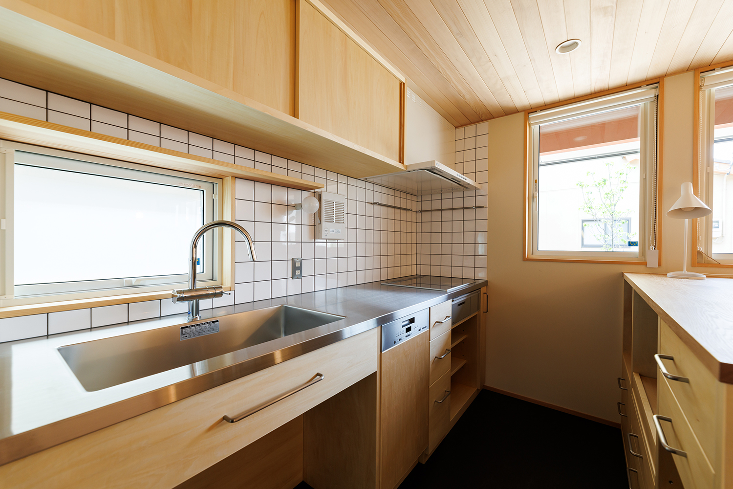 造作キッチンやツガの羽目板天井が、空間に豊かな表情を加え、