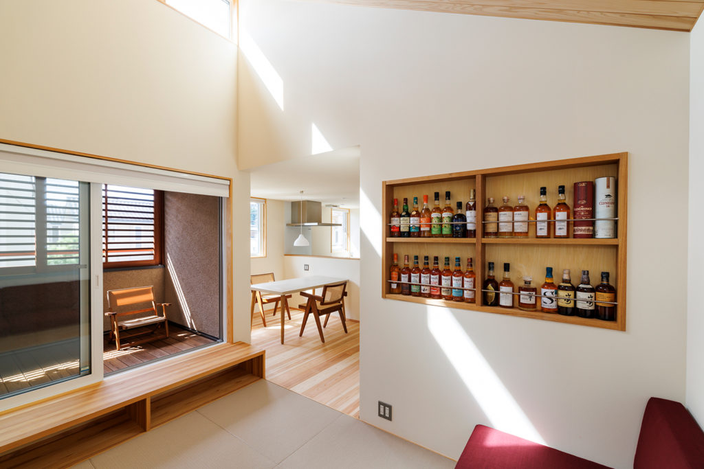 さらに、造作ソファのある畳リビングが家族のくつろぎを支え、延床面積以上の広がりを感じられる住まい。